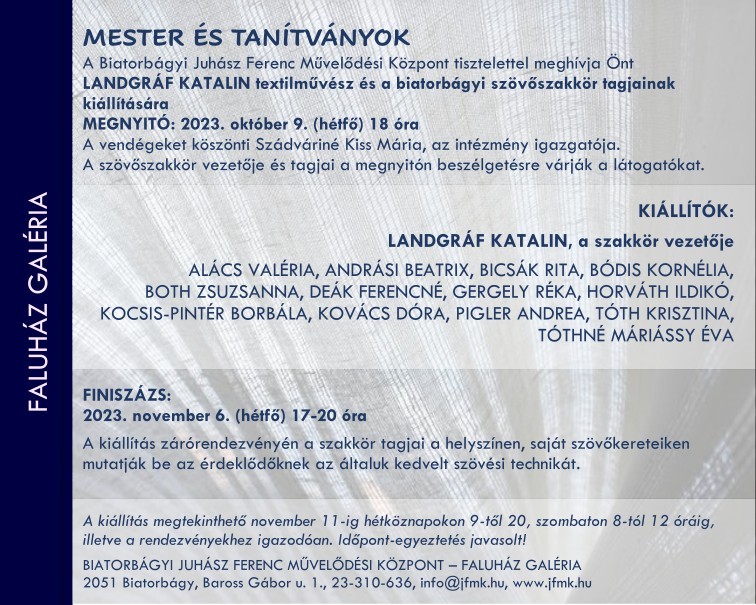 Landgráf Katalin textilművész és a biatorbágyi szövőszakkör tagjainak kiállítása. A kiállítás 2023. november 4-éig tekinthető meg és november 6-án 17 órától a Finiszázs keretén belül a szakkör tagjai bemutatják az érdeklődőknek az általuk használt szövési technikát.